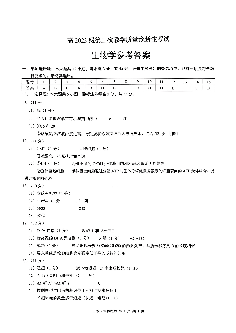 泸州市高2023级第二次教学质量诊断性考试 生物答案.pdf