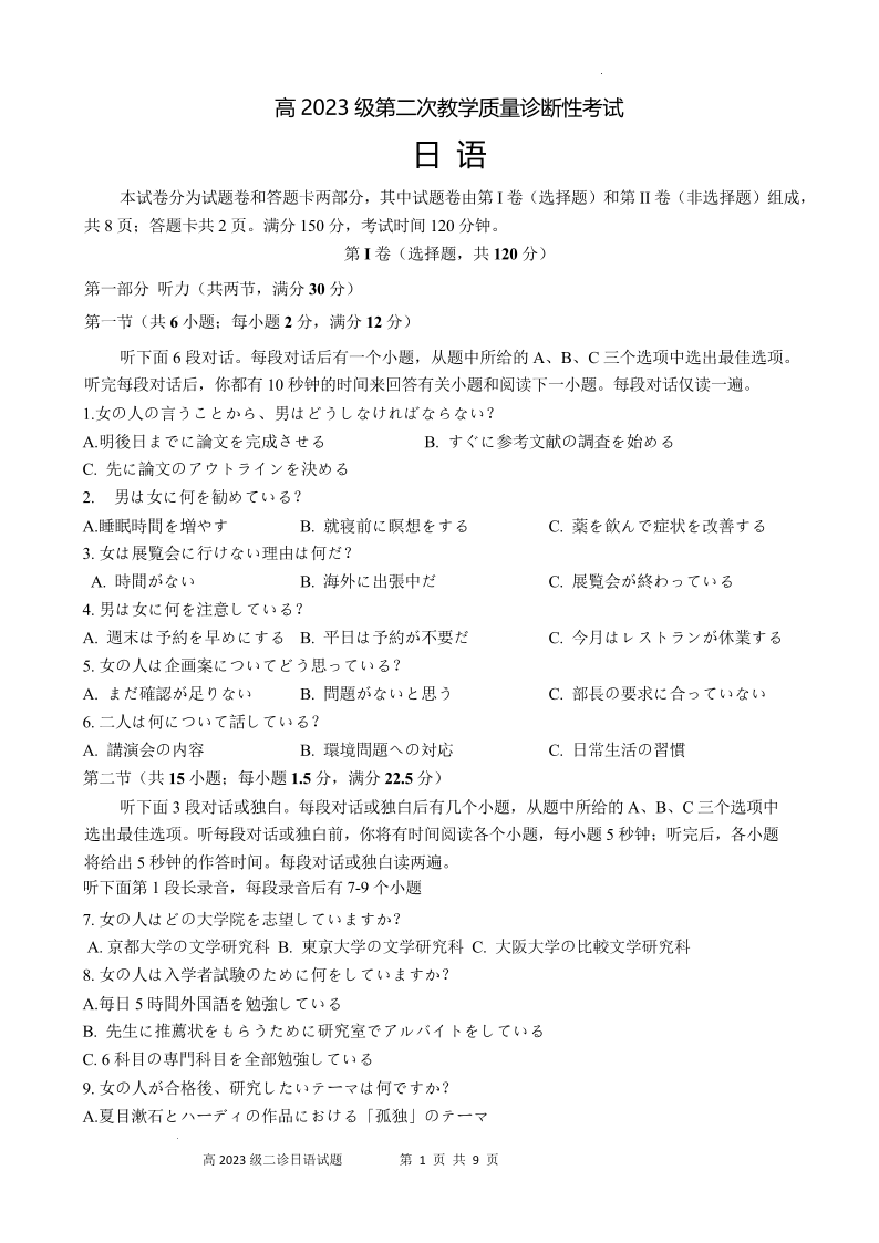 泸州市高2023级第二次教学质量诊断性考试 日语.pdf