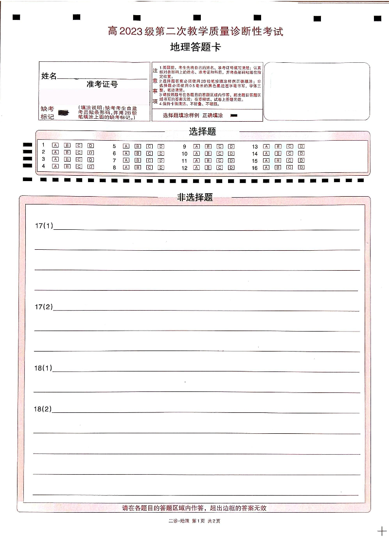 泸州市高2023级第二次教学质量诊断性考试 地理答题卡.pdf