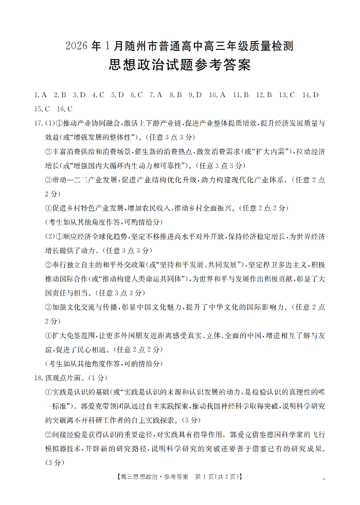 2026年1月随州市普通高中高三年级期末质量检测 政治答案.pdf
