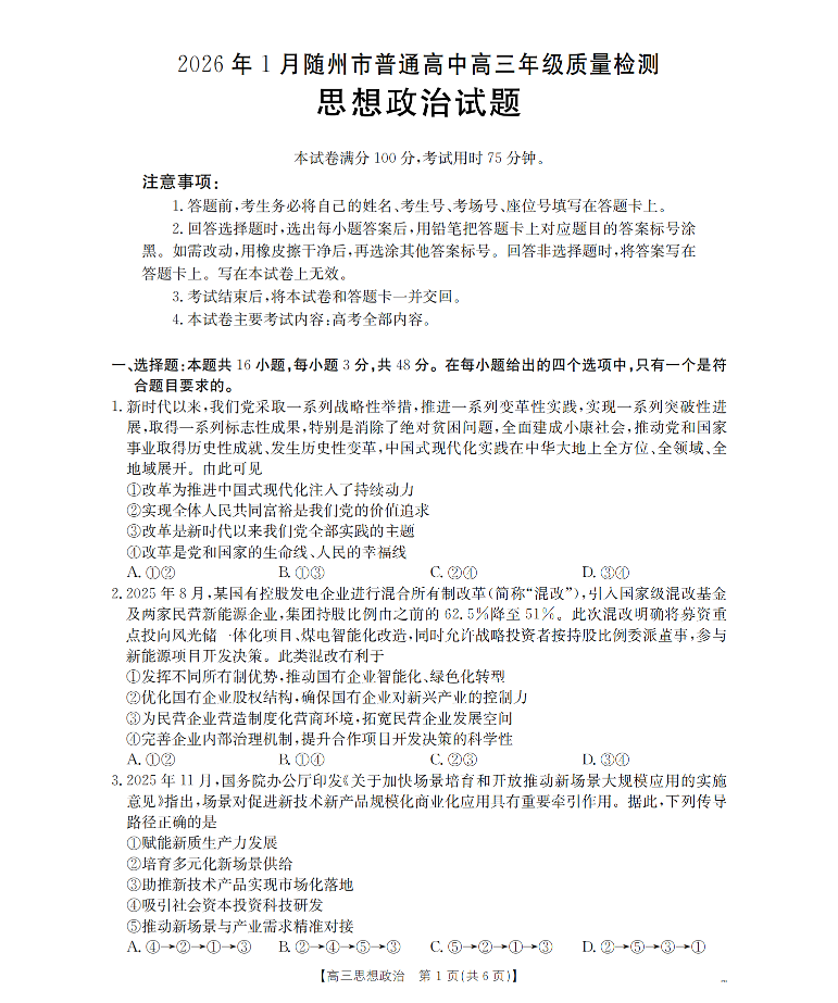 2026年1月随州市普通高中高三年级期末质量检测 政治.pdf