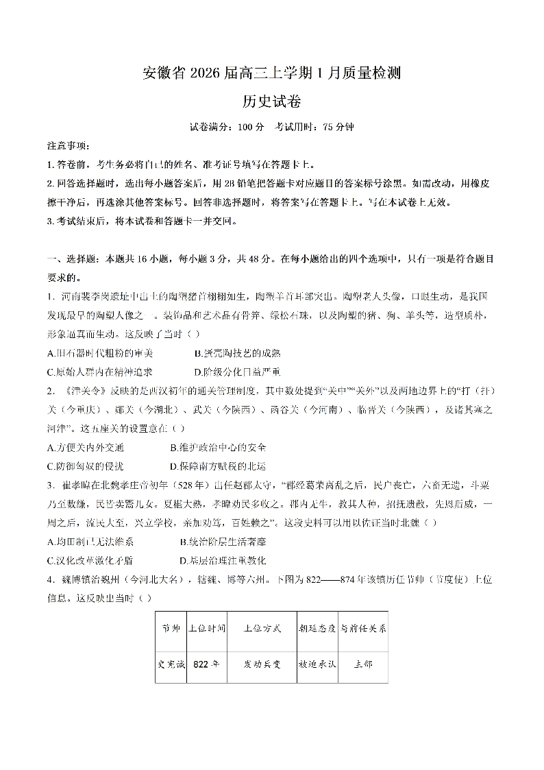 安徽省2026届高三年级上学期1月质量检测 历史试题(含答案).pdf