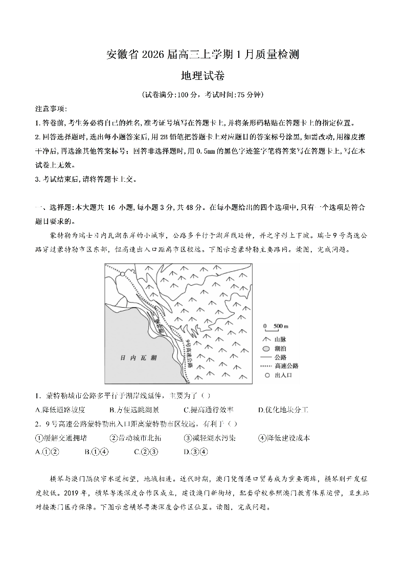 安徽省2026届高三年级上学期1月质量检测 地理试题(含答案).pdf