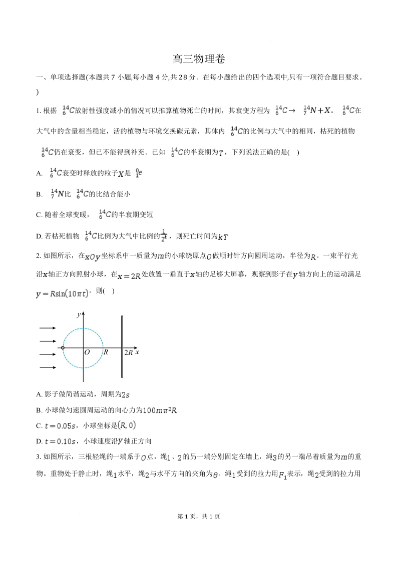 河北省沧州市六县一中2026届高三一模 物理试题(含答案).docx