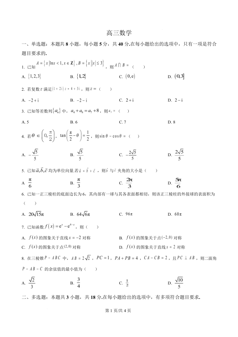 河北省沧州市六县一中2026届高三一模 数学.docx