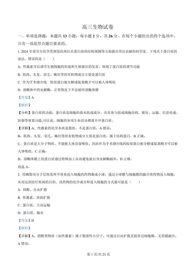 河北省沧州市六县一中2026届高三一模 生物答案.docx