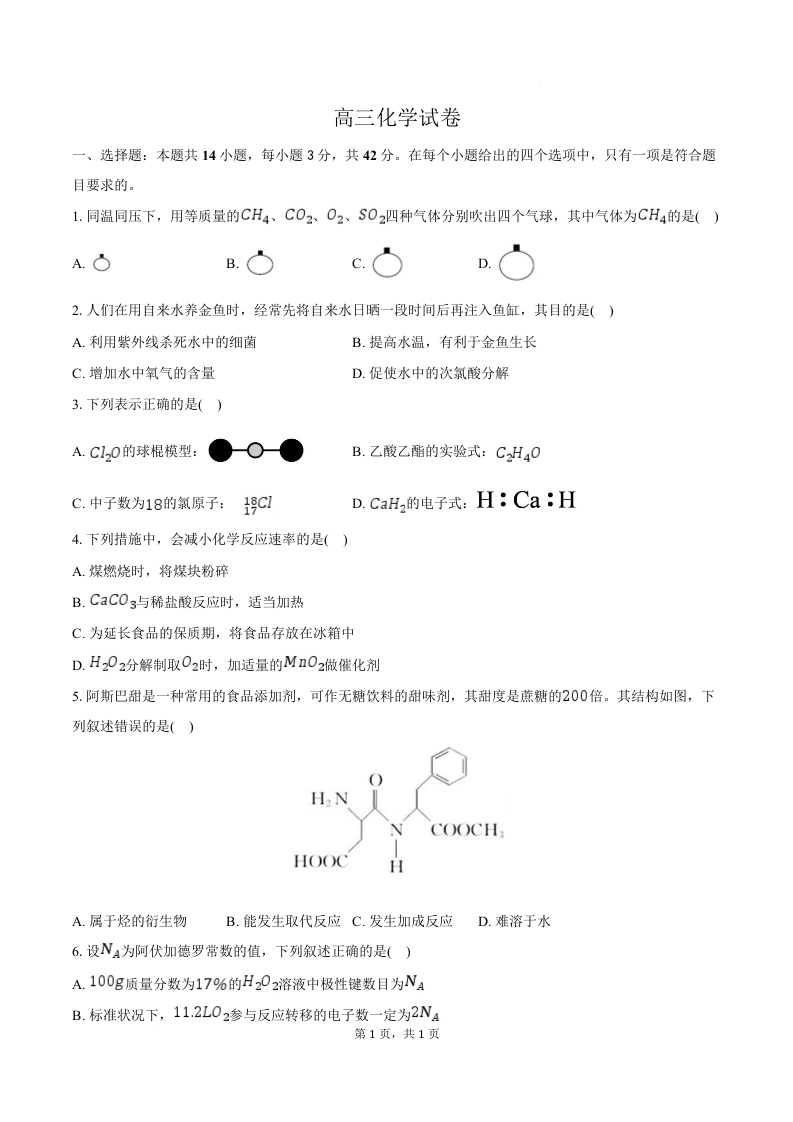 河北省沧州市六县一中2026届高三一模 化学试题(含答案).docx
