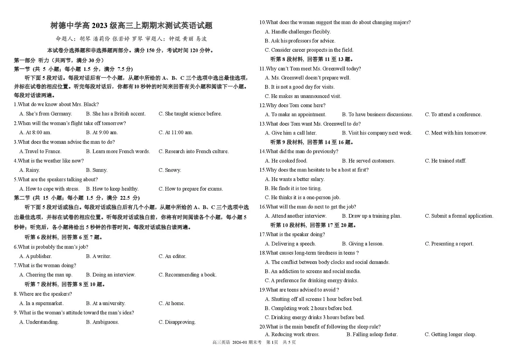 树德中学高2023级高三上期期末测试 英语试题(含答案).pdf
