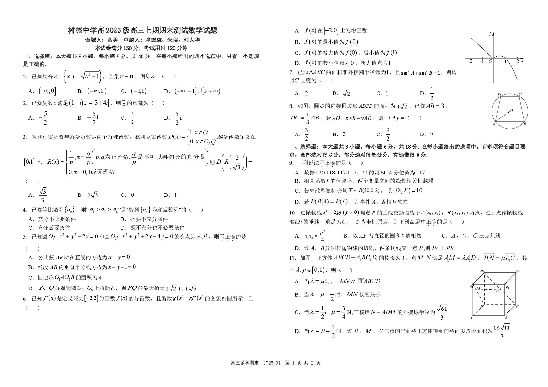 树德中学高2023级高三上期期末测试 数学试题(含答案).pdf