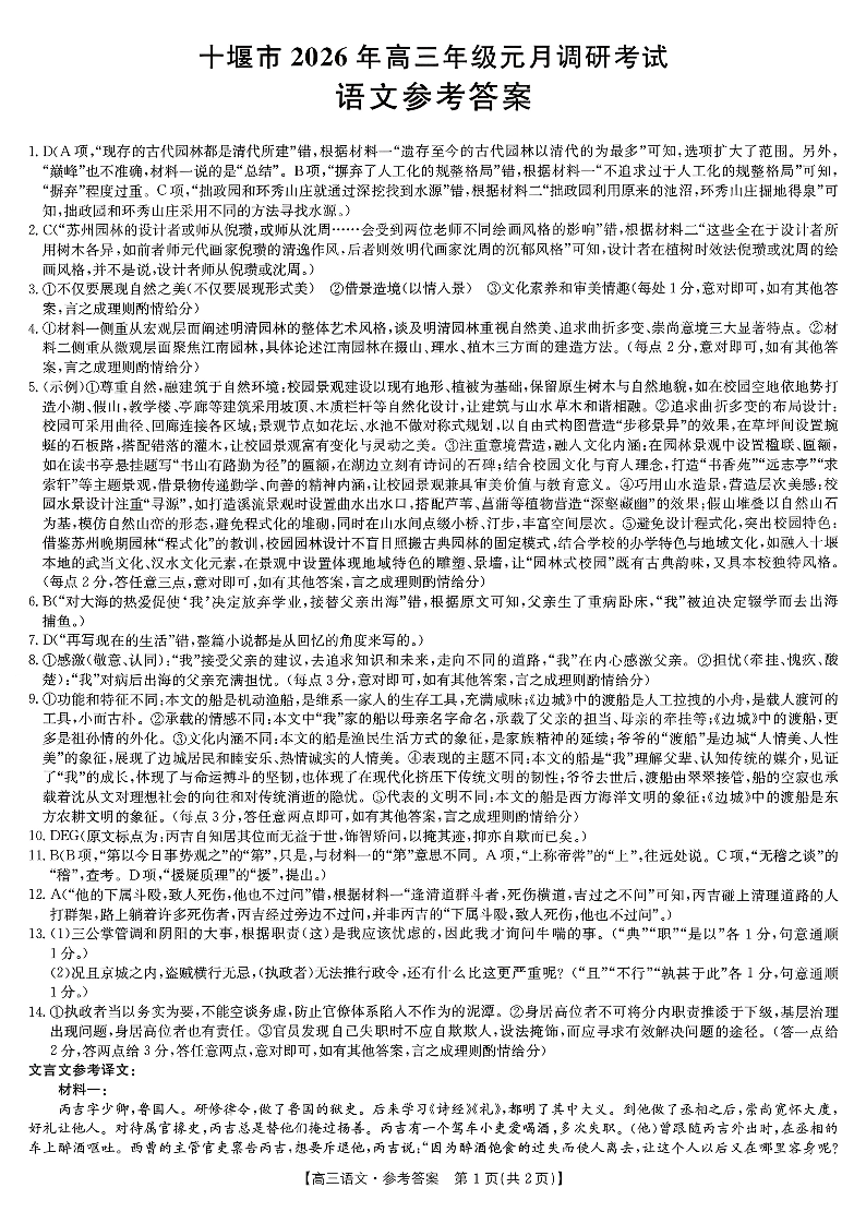 十堰市2026年高三年级元月调研考试 语文答案.pdf