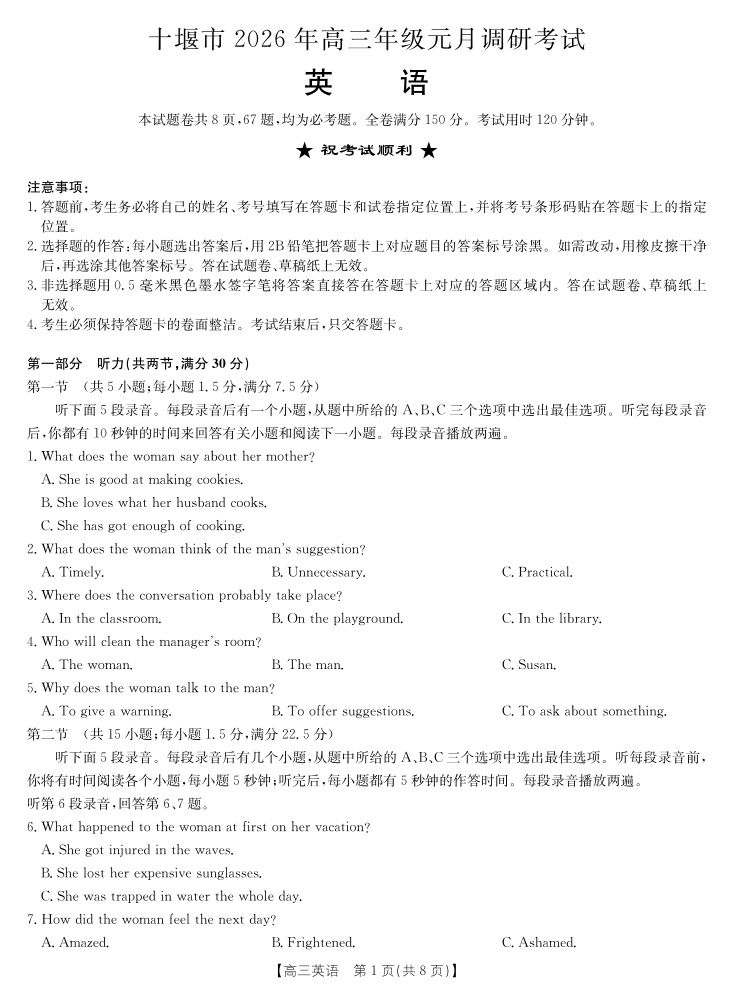 十堰市2026年高三年级元月调研考试 英语.pdf