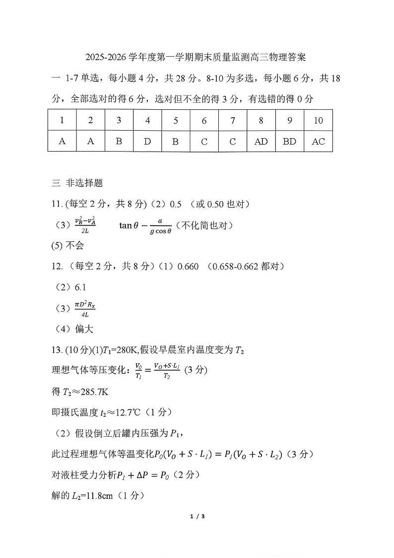 驻马店2025-2026学年度第一学期高三期末质量监测 物理答案.pdf