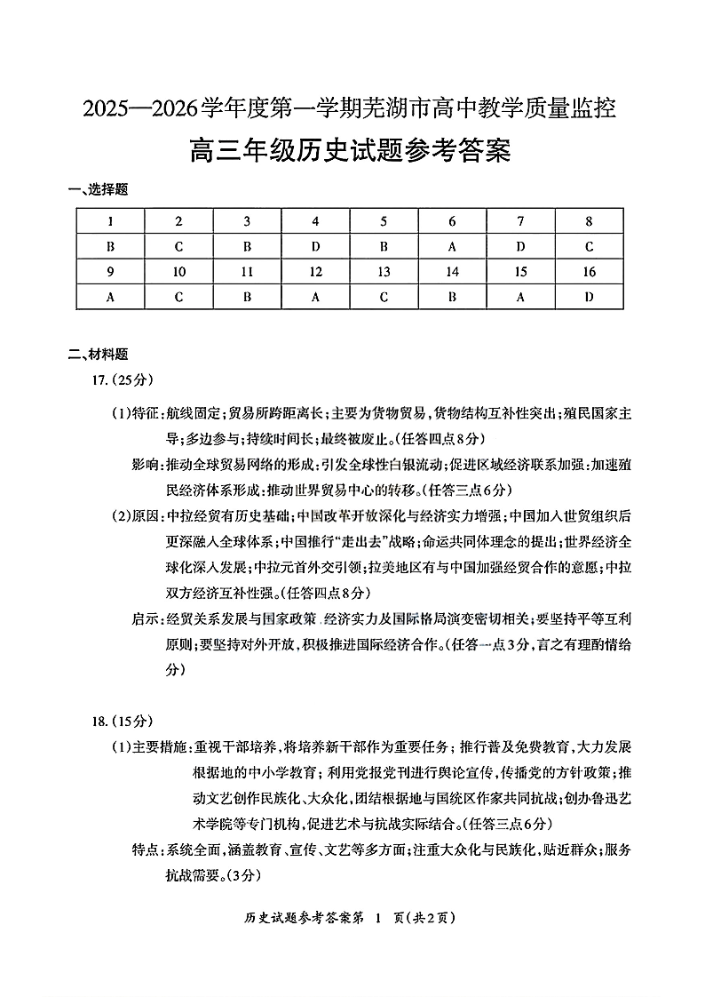 2025-2026学年度第一学期芜湖市高中教学质量监控 历史答案.pdf
