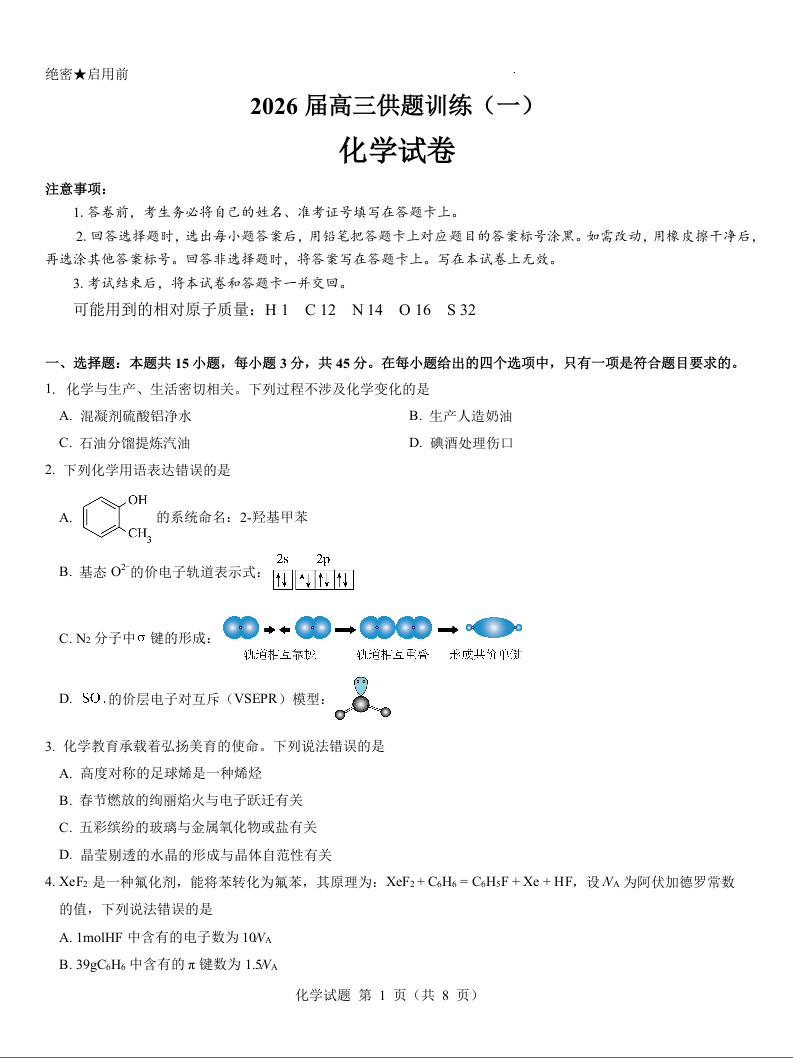 新疆2026届高三供题训练(一)化学试题.docx