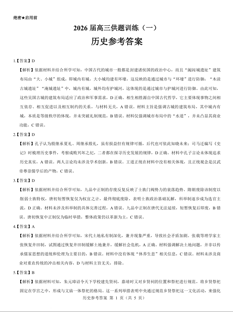 新疆2026届高三供题训练(一)历史参考答案.docx