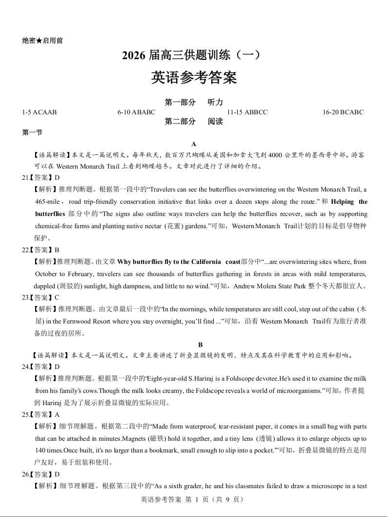 重庆市2026届高三供题训练(一)英语参考答案.docx