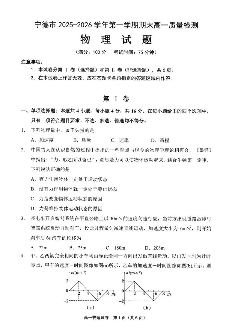 【物理】宁德市2025-2026学年第一学期期末高一质量检测.pdf