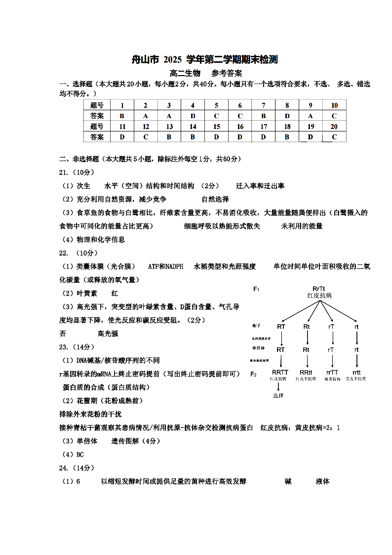 浙江省舟山市2025学年高二第一学期期末检测 生物答案.pdf