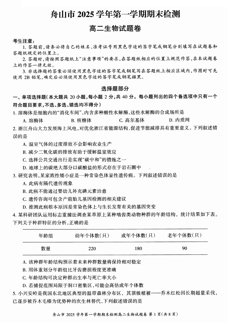 浙江省舟山市2025学年高二第一学期期末检测 生物.pdf