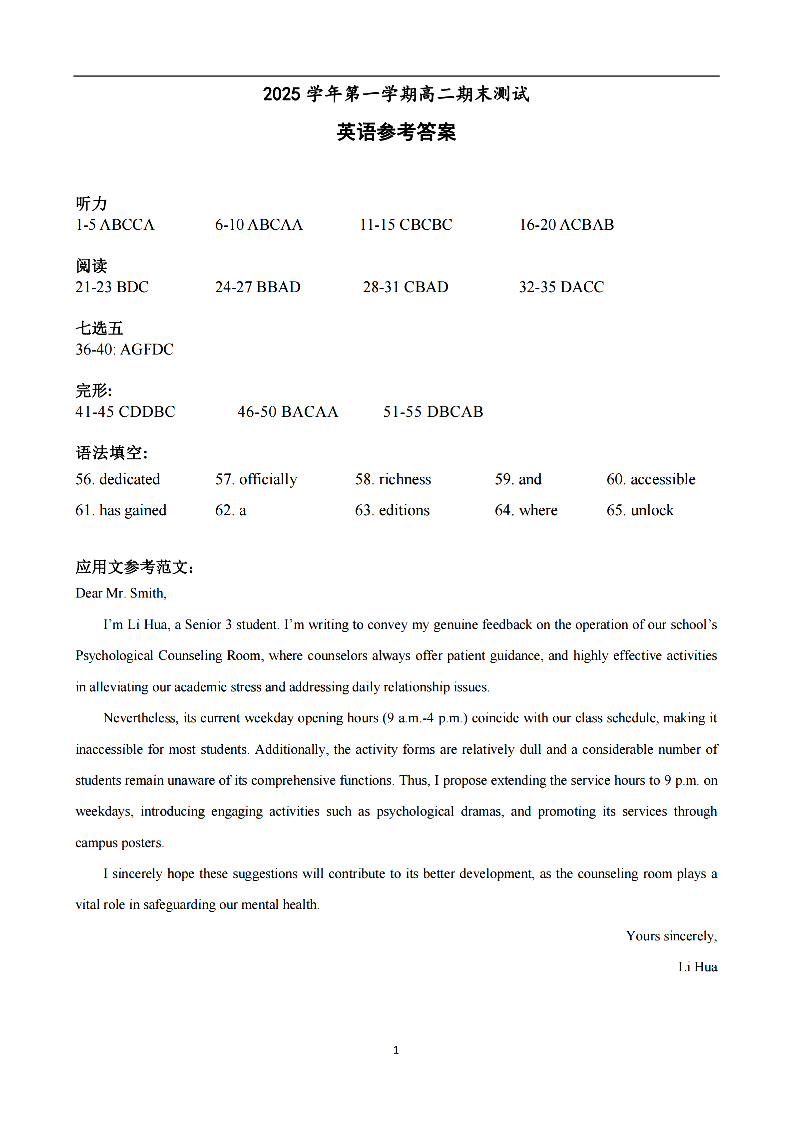 浙江省宁波市慈溪市2025学年高二第一学期期末测试 英语答案.pdf