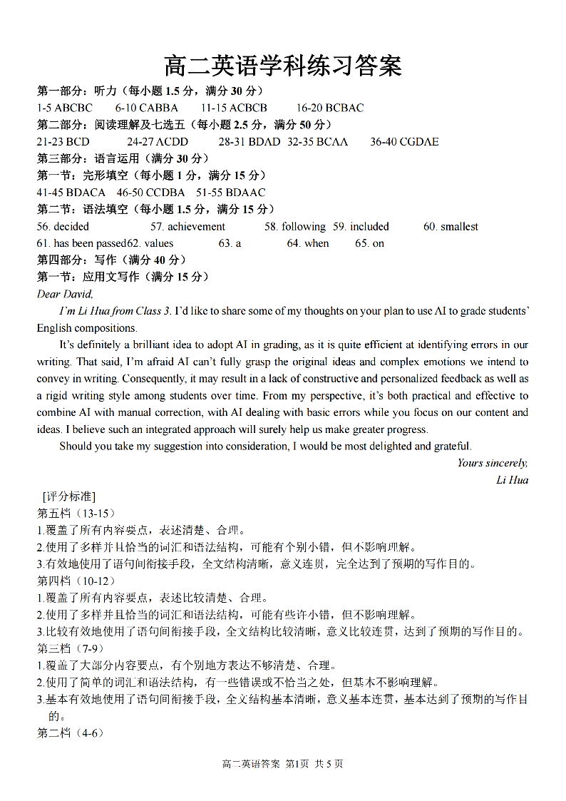 浙江省宁波三锋教研联盟2025学年高二第一学期期末测试 英语答案.pdf