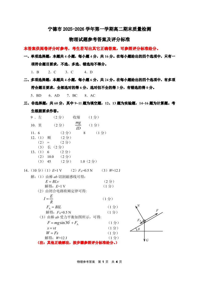 【物理答案】宁德市2025-2026学年第一学期期末高二质量检测.pdf