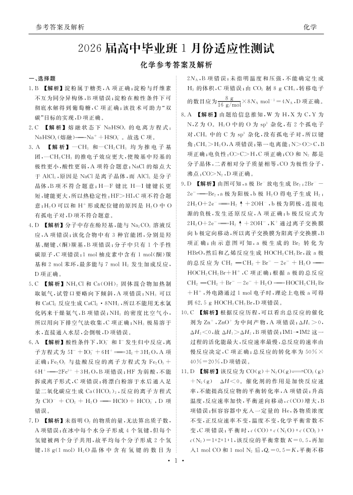 化学答案(2026届高中毕业班1月份适应性测试).pdf