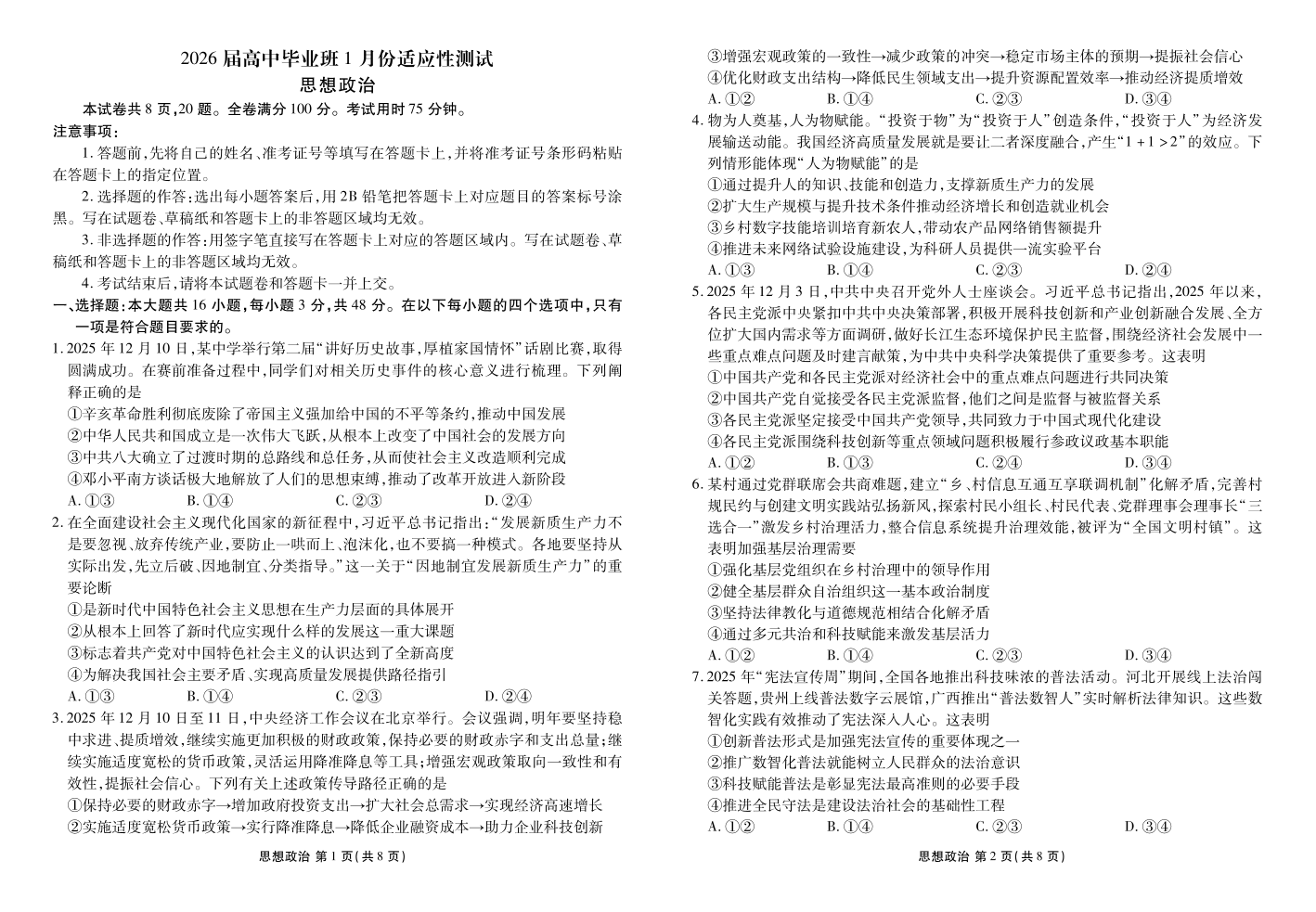 政治正文(2026届高中毕业班1月份适应性测试).pdf