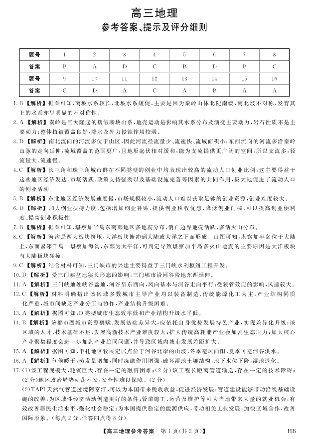 河北省邯郸市2026年高三上学期二月份金科大联考 地理答案.pdf