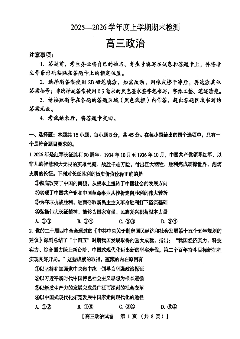 三门峡市2025-2026学年度高三上学期期末检测 政治.pdf