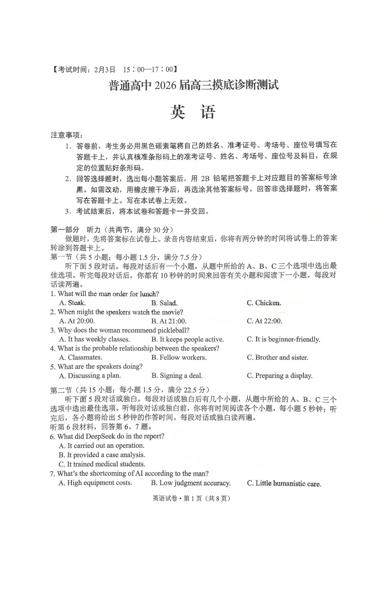 云南省昆明市普通高中2026届高三摸底诊断测试 英语.pdf