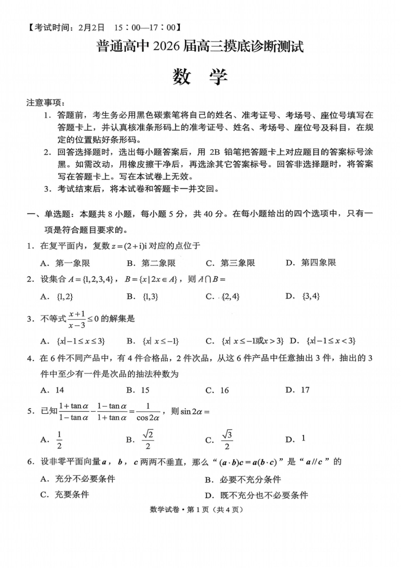 云南省昆明市普通高中2026届高三摸底诊断测试 数学.pdf