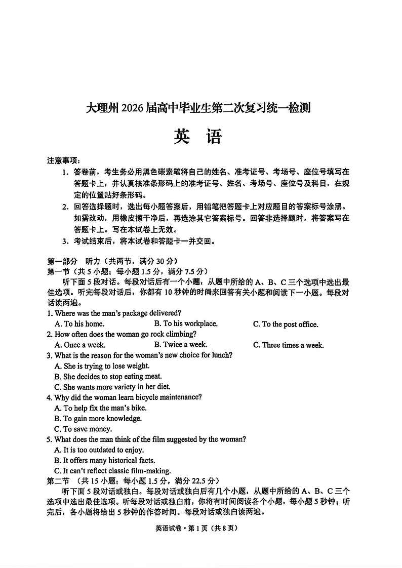 云南省大理州2026届高中毕业生高三年级第二次复习统一检测 英语试题(含答案).pdf