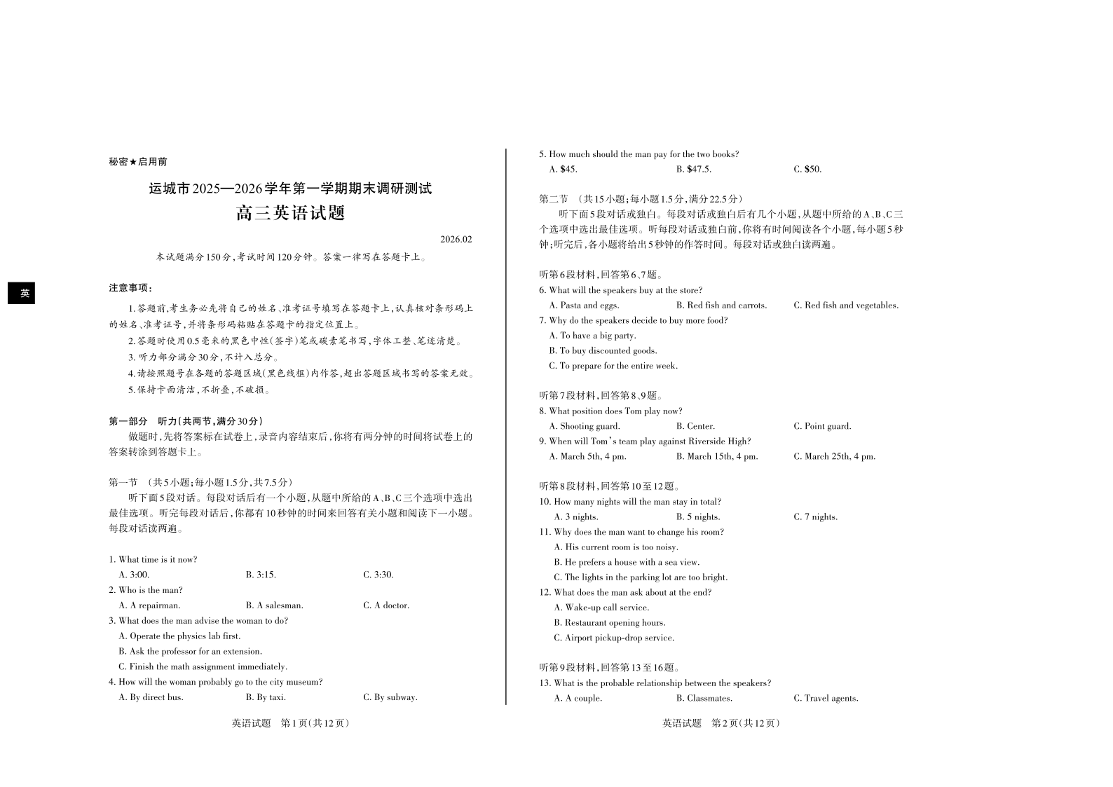 运城市2025—2026学年第一学期高三期末调研测试 英语.pdf