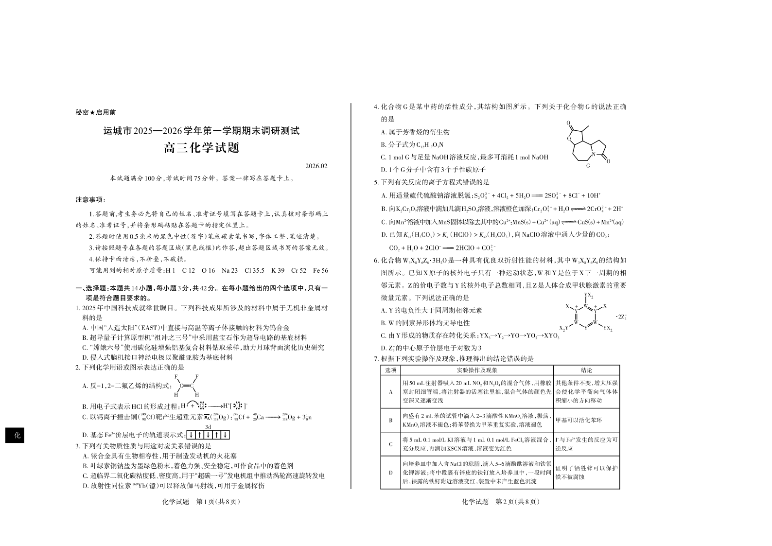 运城市2025—2026学年第一学期高三期末调研测试 化学.pdf