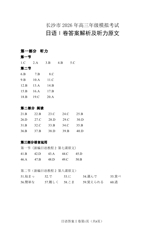长沙市2026年高三年级模拟考试 日语答案.pdf