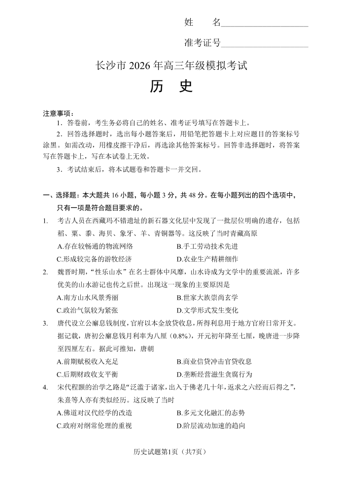 长沙市2026年高三年级模拟考试 历史.pdf