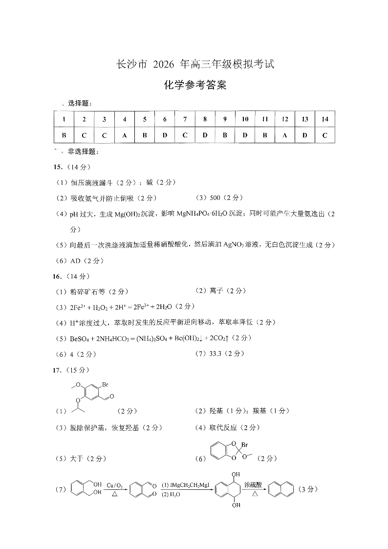 长沙市2026年高三年级模拟考试 化学答案.pdf