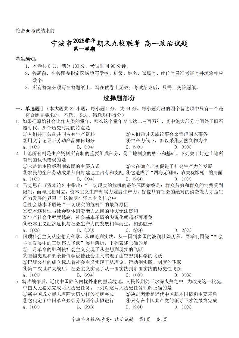 浙江省宁波九校联盟2025学年高一第一学期期末联考 政治.pdf