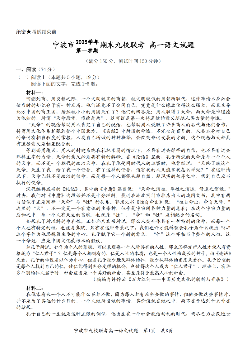 浙江省宁波九校联盟2025学年高一第一学期期末联考 语文.pdf