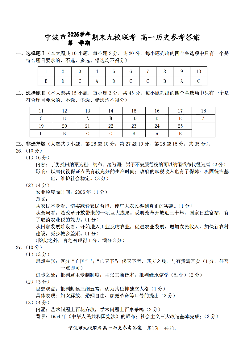 浙江省宁波九校联盟2025学年高一第一学期期末联考 历史答案.pdf