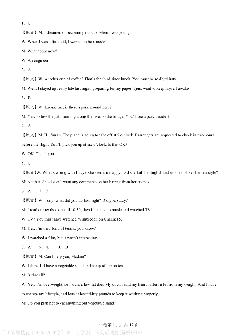 攀枝花市2025-2026学年度高一(上)教学质量监测样卷 英语答案.pdf