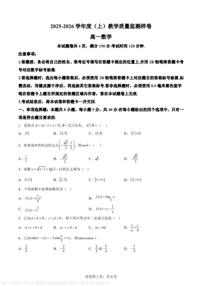 攀枝花市2025-2026学年度高一(上)教学质量监测样卷 数学.pdf