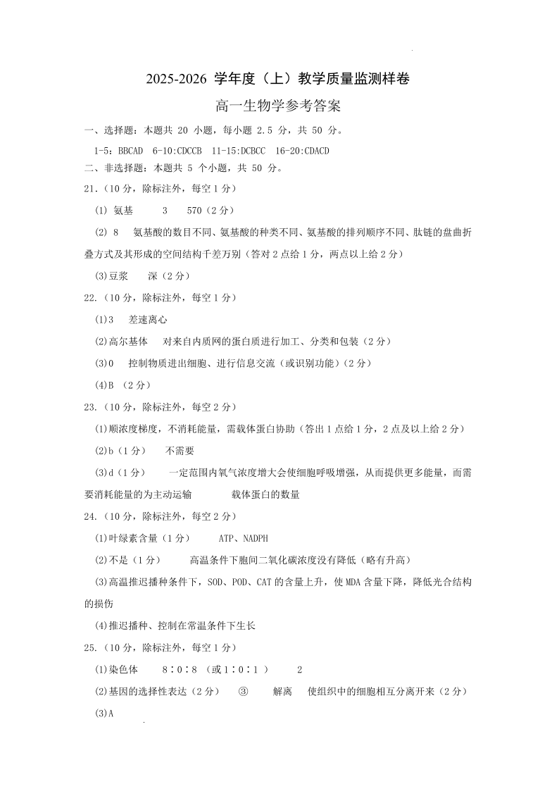 攀枝花市2025-2026学年度高一(上)教学质量监测样卷 生物答案.pdf