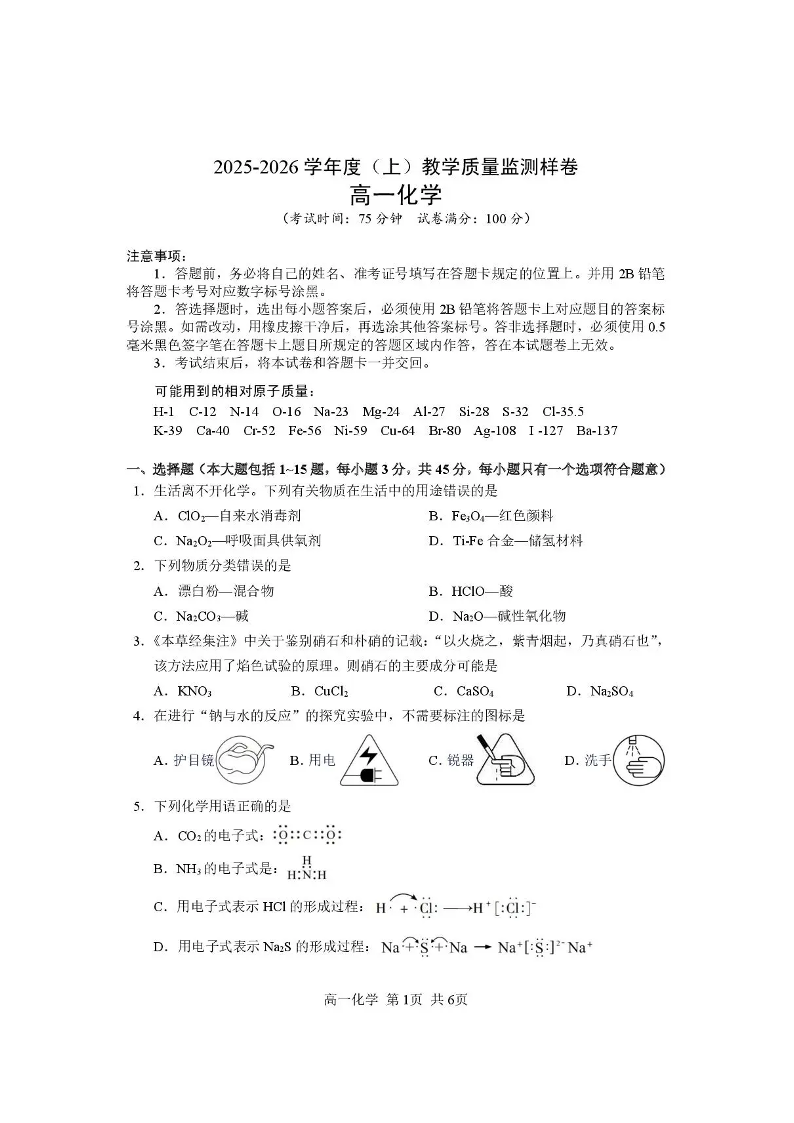 攀枝花市2025-2026学年度高一(上)教学质量监测样卷 化学.pdf