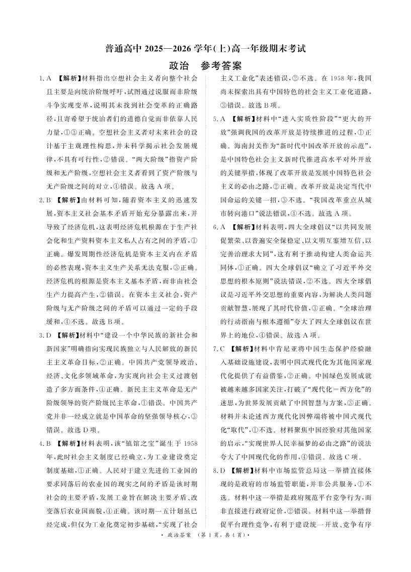 河南省普通高中青桐鸣大联考2025-2026学年(上)高一年级期末考试 政治答案.pdf