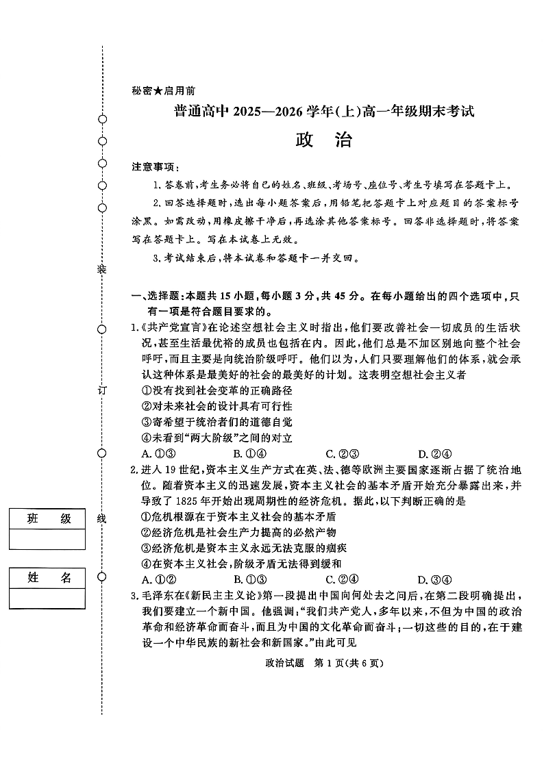 河南省普通高中青桐鸣大联考2025-2026学年(上)高一年级期末考试 政治.pdf