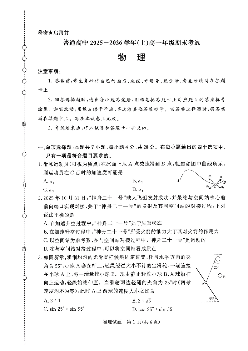 河南省普通高中青桐鸣大联考2025-2026学年(上)高一年级期末考试 物理.pdf