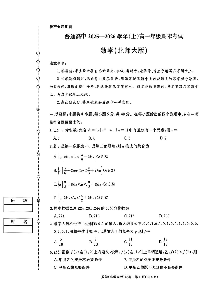 河南省普通高中青桐鸣大联考2025-2026学年(上)高一年级期末考试 数学(北师大版).pdf