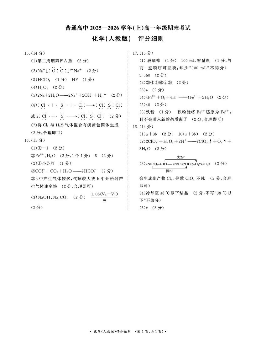 河南省普通高中青桐鸣大联考2025-2026学年(上)高一年级期末考试 化学(人教版)评分细则.pdf